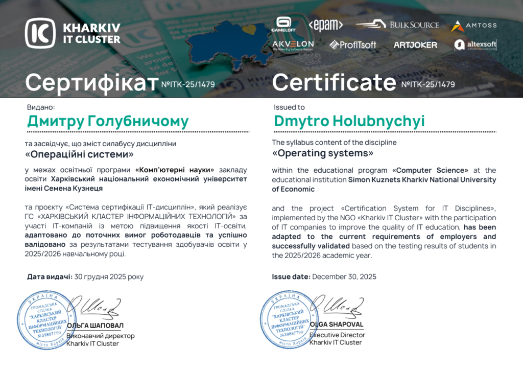 За результатами сертифікації підтверджено, що зміст силабусу навчальної дисципліни «Операційні системи» 💻, яка викладається в межах освітньої програми «Комп’ютерні науки» Харківського національного економічного університету імені Семена Кузнеця 🏛️, адаптований до актуальних вимог роботодавців ІТ-галузі та відповідає сучасним професійним стандартам 📈.